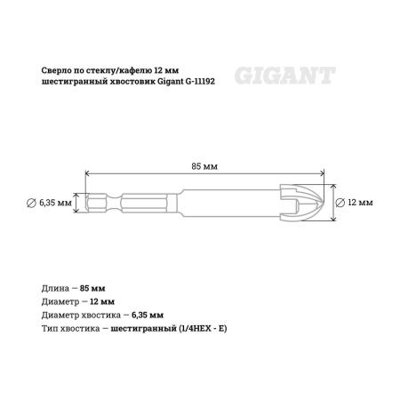 Gigant сверло стекло/кафель 12мм шестигранный хвостовик G-11192