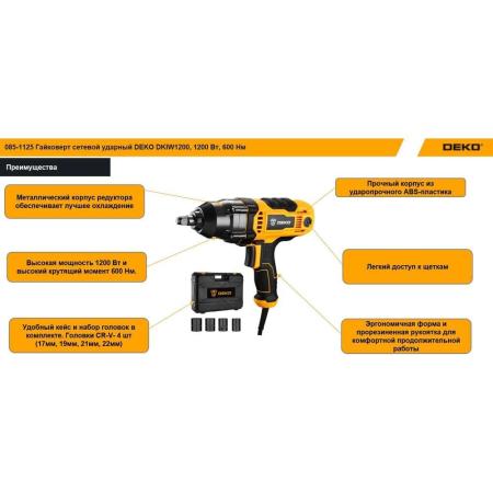 DEKO Гайковерт сетевой ударный DKIW1200, 1200 Вт, 600 Нм 085-1125